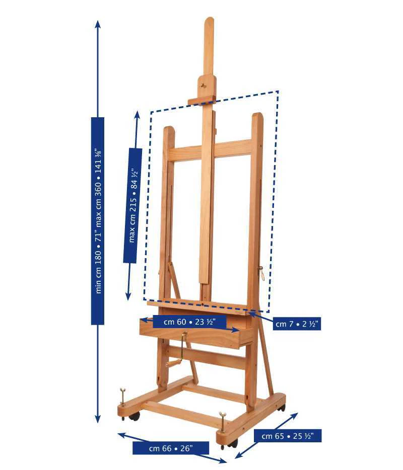The Mabef M05 Studio Easels are made in Italy from the finest oiled beechwood, the Mabef M-05 uniquely features a crank that lets you adjust the height of the working area, and allows for control over canvas elevation. The base includes both four lockable casters and two storage drawers to hold your painting supplies. The sliding mast extends from 180cm to 360cm high and accommodates artwork up to 214cm high. The base measures 64cm.W × 66cm.D.